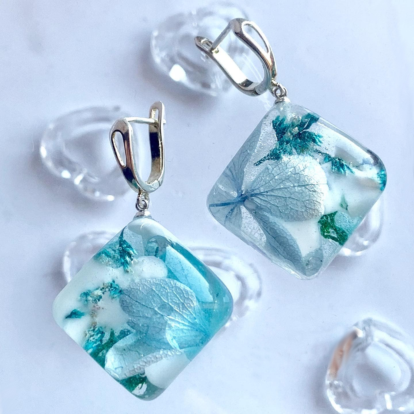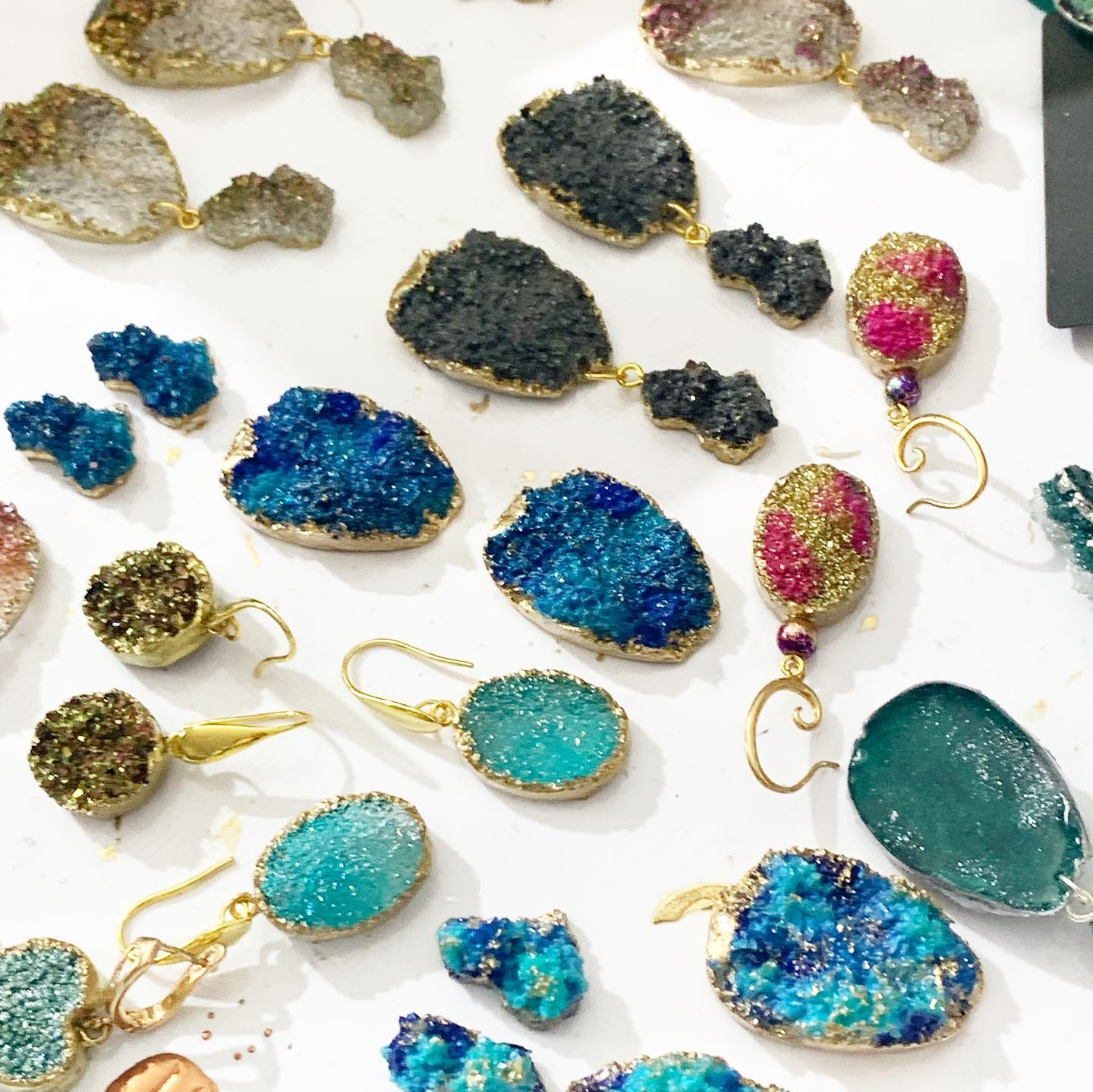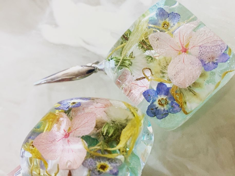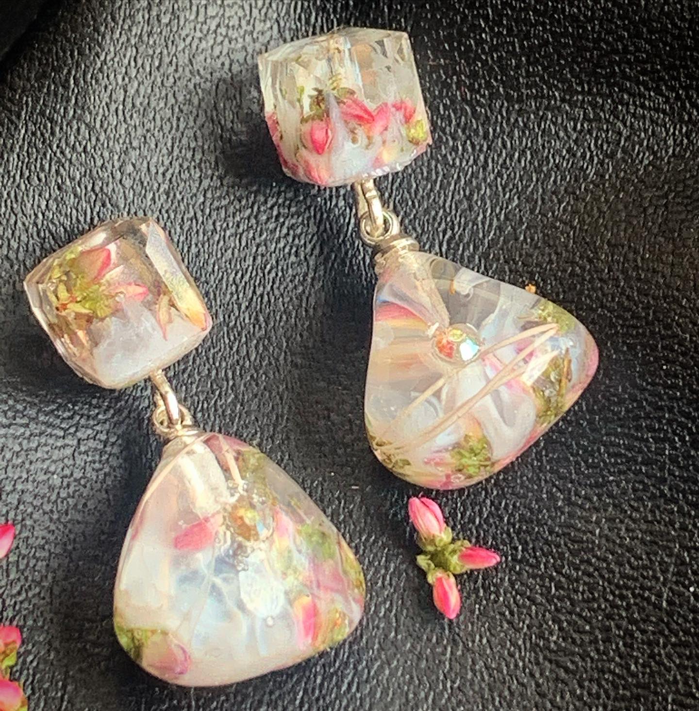 Gioielli realizzati interamente a mano e con il cuore, pezzi unici non riproducibili, creati in resina epossidica di alta qualità e con materiali pregiati quali pigmenti indiani come purissime polveri di mica, inchiostri, fiori veri essiccati, cristalli, pietre semi preziose e altri materiali di pregio.